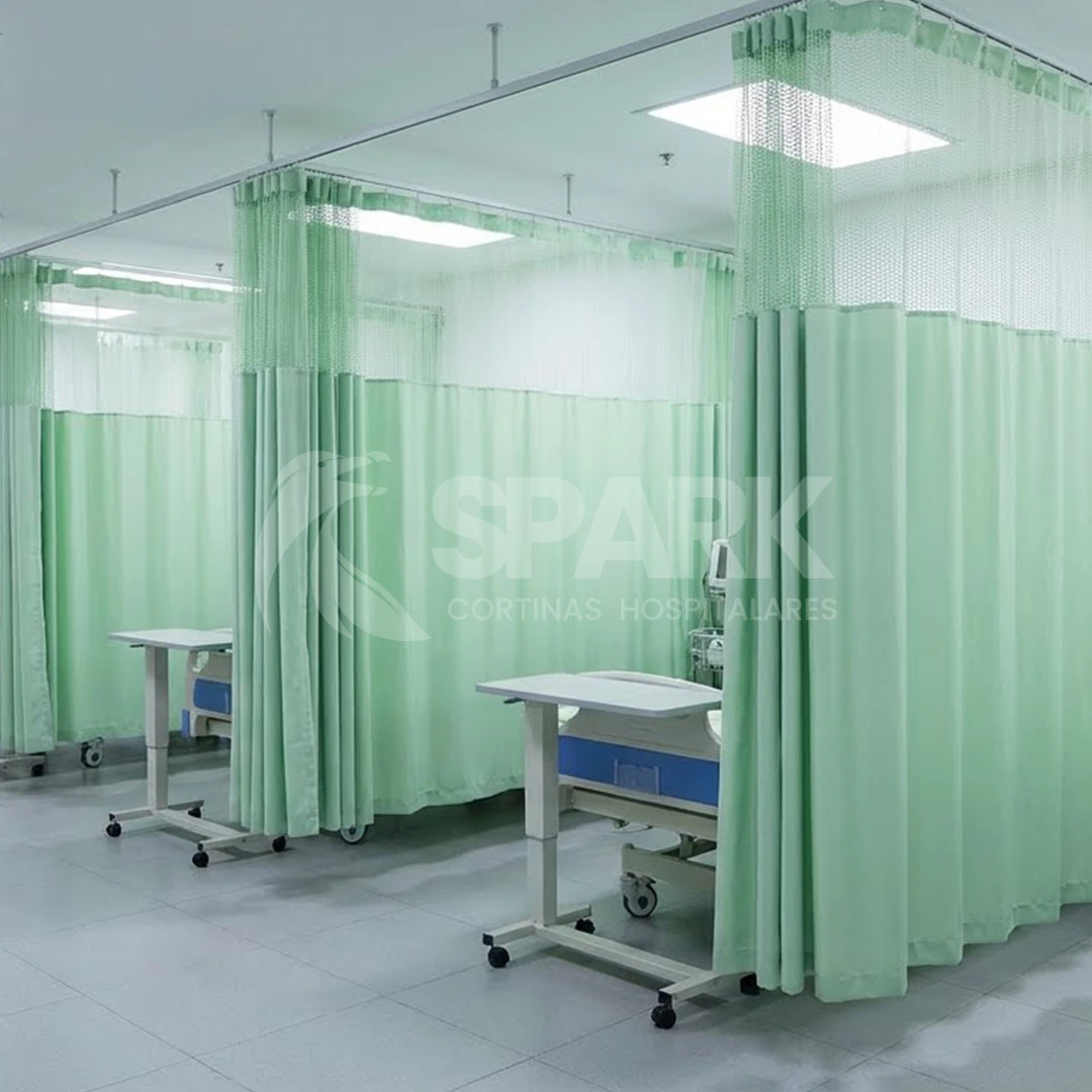 A tela na parte superior é um requisito técnico importante para a segurança e climatização. Ela permite a correta circulação de ar condicionado no ambiente e, principalmente, garante que a água dos sprinklers (sistema de combate a incêndio) alcance todo o leito em caso de emergência, não sendo bloqueada pelo tecido. Nossas cortinas seguem o padrão exigido de proporção entre tecido e tela.